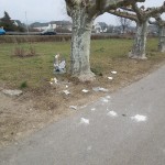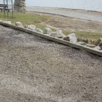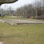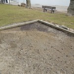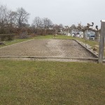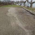 Die Spielfäche der Boulebahn sieht schlimm aus. Der Wellenschlag vorbeifahrender Schiffe und insbesondere der Fähre hat ganze Arbeit geleistet. Rheinseitig sind die Begrenzungsbalken komplett unterspült und hängen frei in der Luft. Ab der Bahnmitte zur Straßenseite lagert auf dem Platz noch einiger Schlamm vom Hochwasser, der entfernt werden muss, bevor er betonhart wird. Als nicht glücklich erweist sich die beim Bau der Boulebahn eingebrachte Lava-Zwischenschicht. Was unter normalen Umständen für ein schnelles Versickern von Regenwasser sorgt, wird unter den gegebenen Umständen lästig. Bei jedem Hochwasser werden durch den Wellenschlag die größeren Lavastücke freigespült und da sie im Wasser leicht aufschwimmen, werden Sie über den ganzen Platz verteilt. Die Stücke sind aber zu groß, als dass man sie einfach liegen lassen könnte. Außerdem wurde durch das Wasser viel Material von der Oberfläche weggespült. Hier müssen wir kurzfristig schauen, dass wir mit bindigem Material die Löcher schließen und dabei dann auch die Lavastücke einarbeiten.