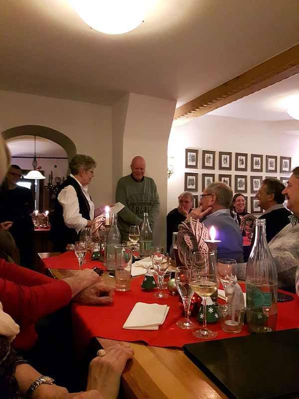 Zum 8. Mal hatte der Vorstand zur Jahresabschluss-/Weihnachtsfeier am 8.12.2017 alle Mitglieder mit Partnern eingeladen und im Vorfeld dafür einen Raum in der Klostermühle in Kiedrich für 35 Personen (Erfahrungswerte) gebucht. Oh je, in der ersten Dezemberwoche summierten sich die Anmeldungen auf 45 !!! Personen, seeehr erfreulich – doch was nun ??? Agnes verbrachte eine schlaflose Nacht bezüglich der Räumlichkeit, doch sie schaffte es, zusammen mit Frau Witte, durch Umorganisation und Umsetzen von anderen Gästen in andere Räumlichkeiten, dass wir auch zusätzlich den vorderen Restaurationsraum nutzen konnten und so „unter uns“ waren, auch wenn wir nicht alle zusammensitzen konnten und alles etwas beengt war. Aber Agnes war sicher, dass würde der Gemütlichkeit keinen Abbruch tun – und so war es – wie man später sehen kann.